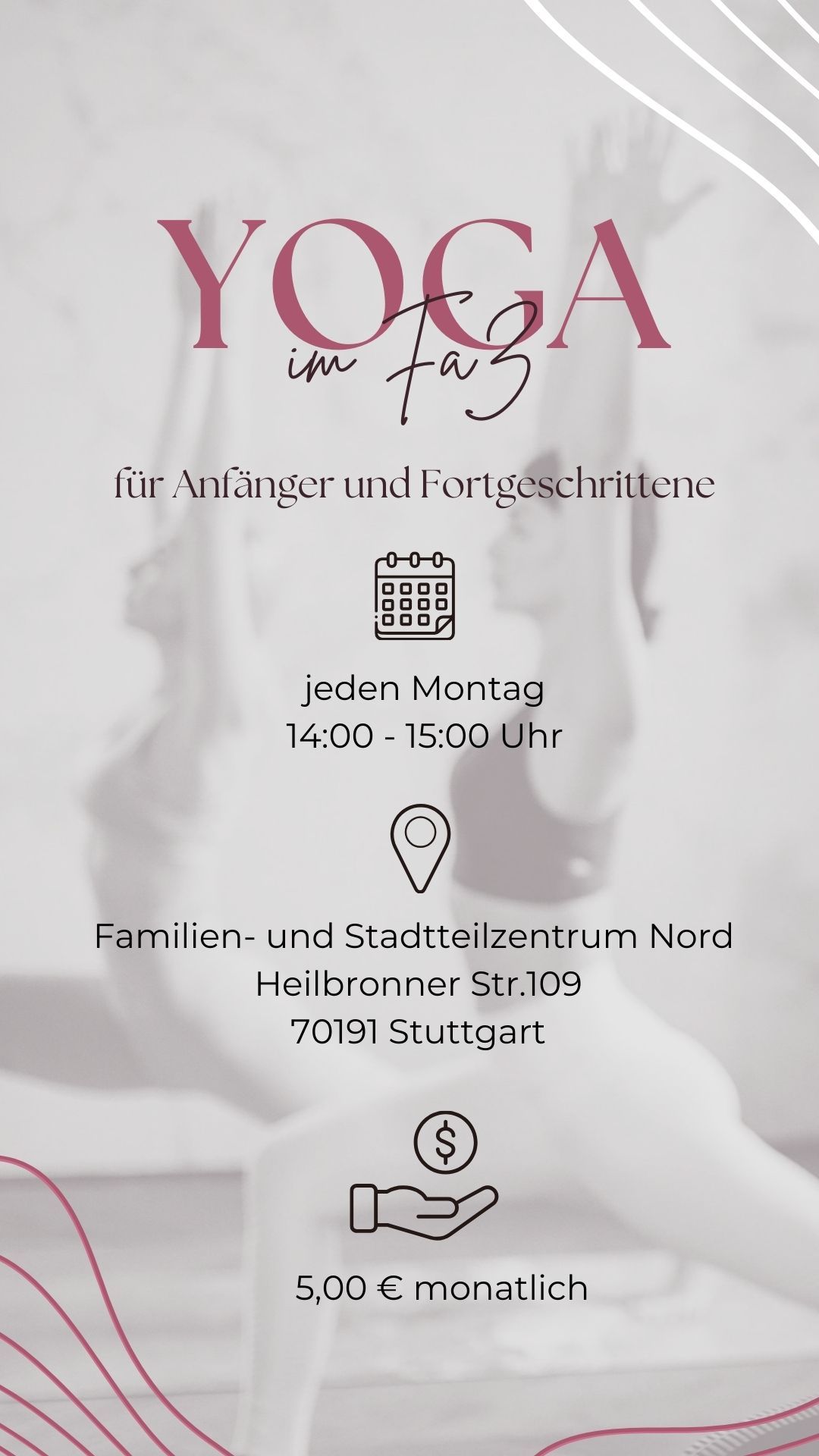 Weil es Freude macht, sich zu bewegen und zu dehnen. Gleichzeitig schulen wir unser (Körper-) Bewusstsein. Wir sind ganz bei uns selbst und vergessen die alltäglichen Belastungen. Bitte bequeme Kleidung und Socken mitbringen. Kosten: 5,00€/mtl.