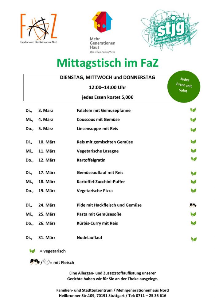 Dienstag + Mittwoch + Donnerstag: 12:00–14:00 Uhr Kulinarische Köstlichkeiten aus aller Welt. Jedes Essen wird frisch zubereitet und mit Salat serviert. Kosten: 5,00 €